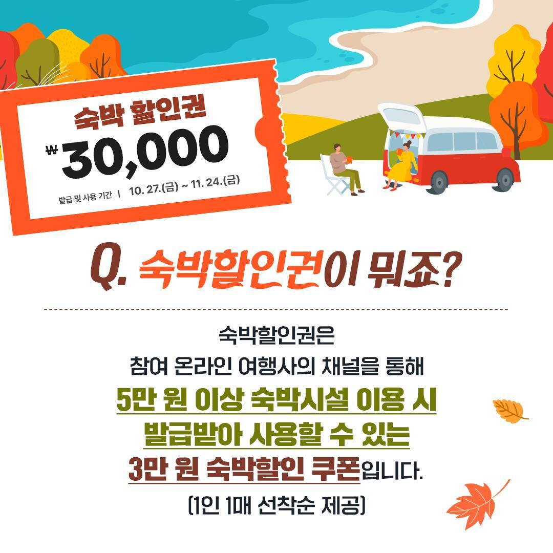 🍁발급 및 사용방법 : 예약하려는 여행사 홈페이지에 접속 ➡️ 매일 오전 10시~ 다음날 오전 7시까지 1인 1매 선착순으로 할인권 발급 ➡️ 숙소 예약 시 할인권 적용