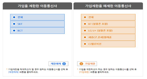 2. 추후 통신사 신규가입을 해야할 경우 가입제한 서비스를 해지하시면 됩니다. 엠세이퍼에 공동인증서로 로그인 →가입제한 서비스 바로가기 클릭 → 가입하려는 통신사를 선택한 후, "제한해제"를 클릭하시면 됩니다.