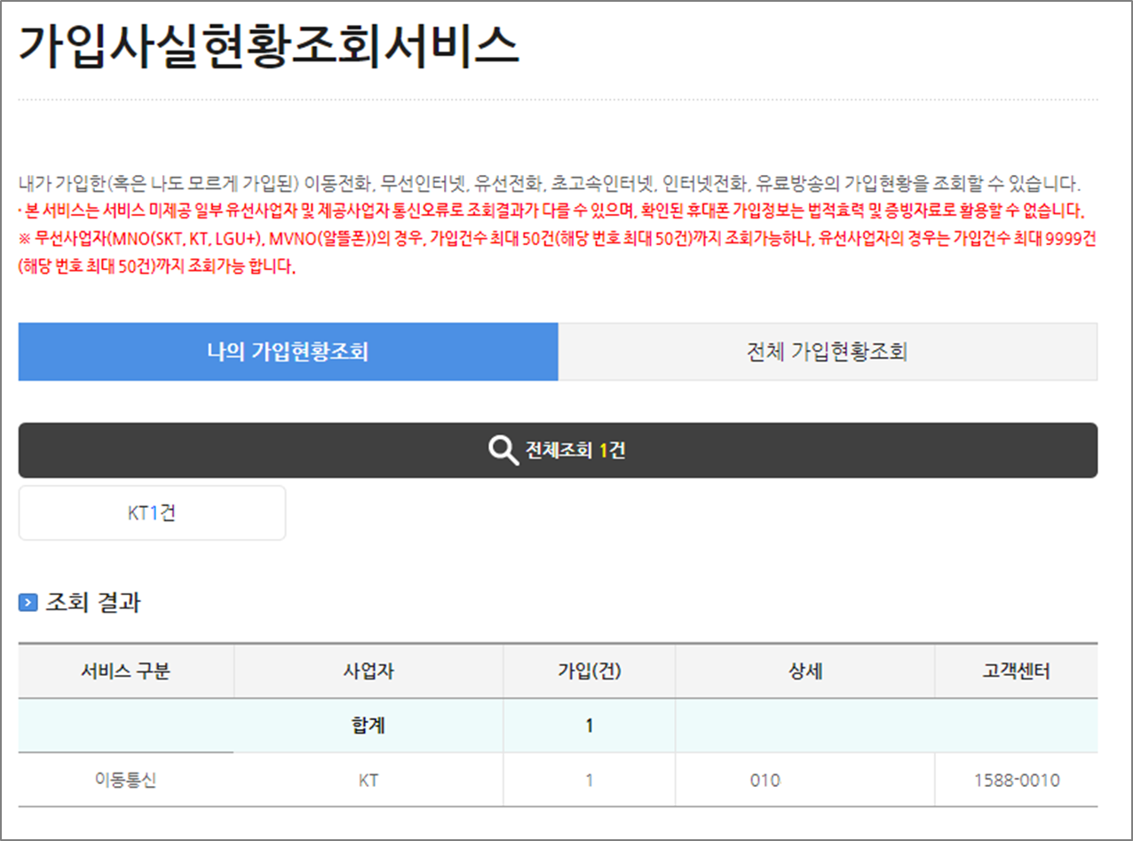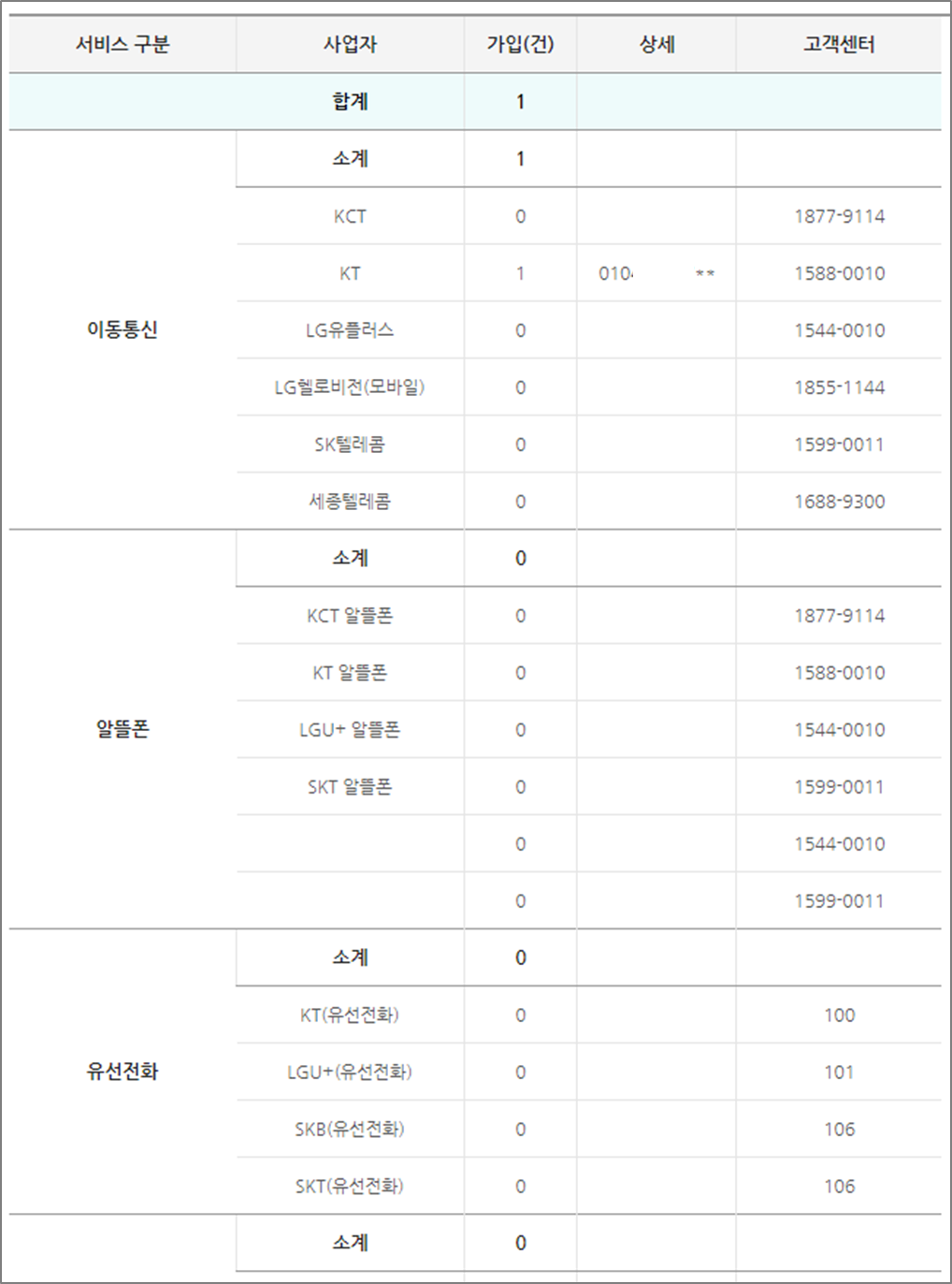 2. 나의 가입현황조회에서 이동전화, 인터넷, 유선전화, 인터넷전화, 유료방송의 가입현황을 확인하실 수 있습니다. 어떤 업체의 정보를 확인하실 수 있는지 아래 캡처화면을 참고해서 명단을 보시기 바랍니다.