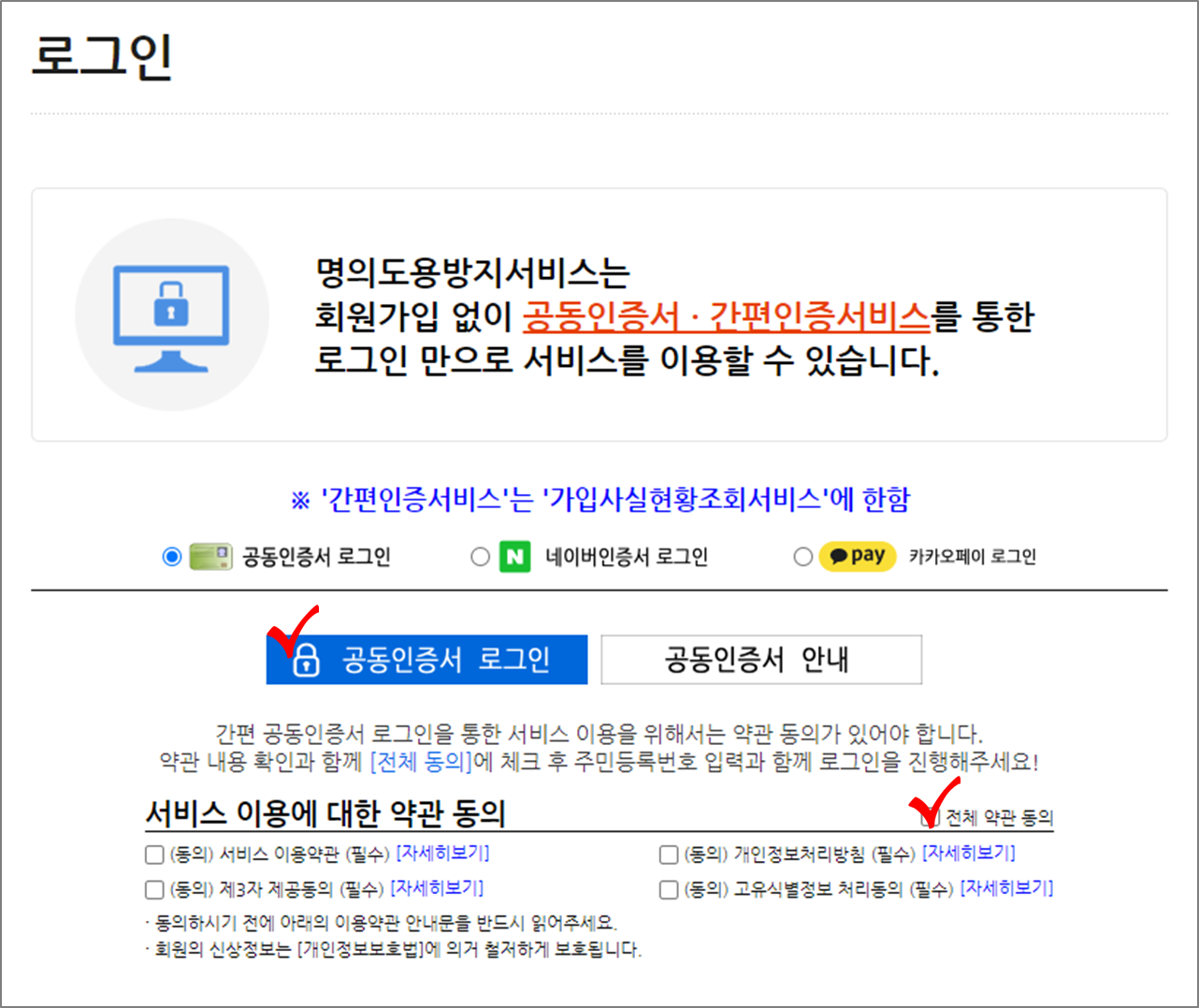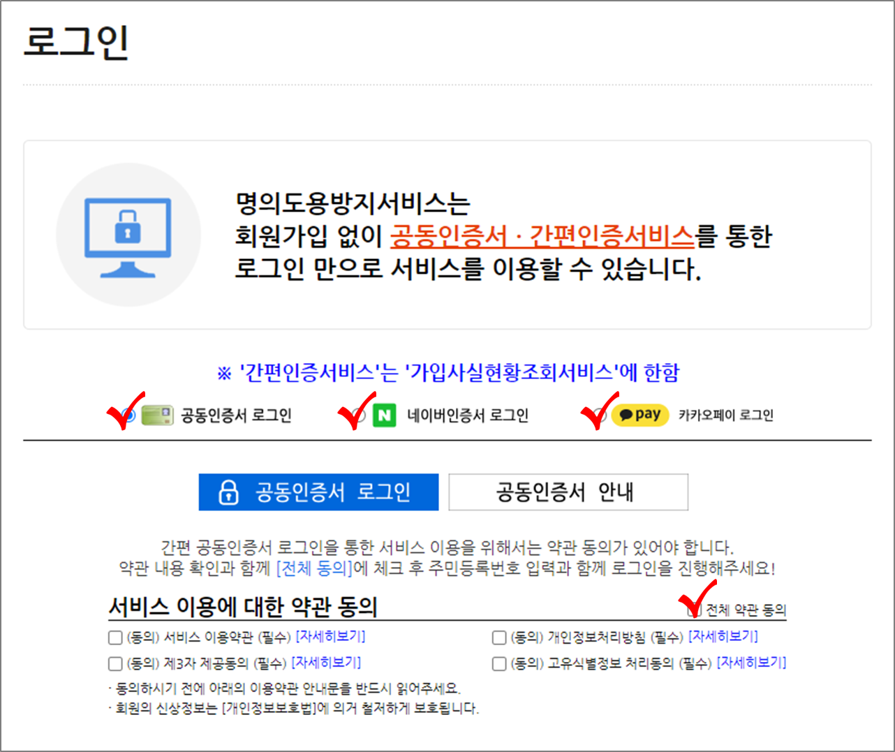 내가 가입하지 않았는데 가입체크가 되어 있다면 명의도용 신고를 하시기 바랍니다.
