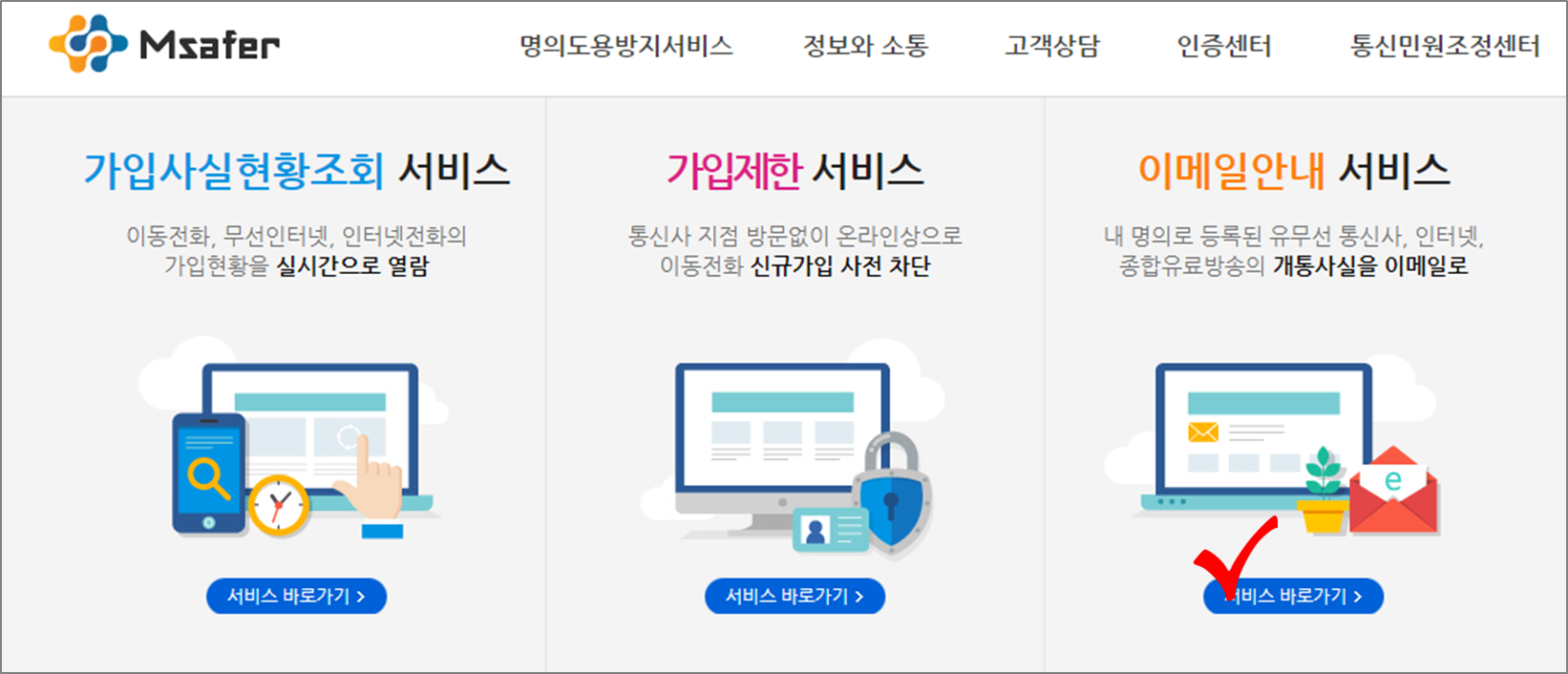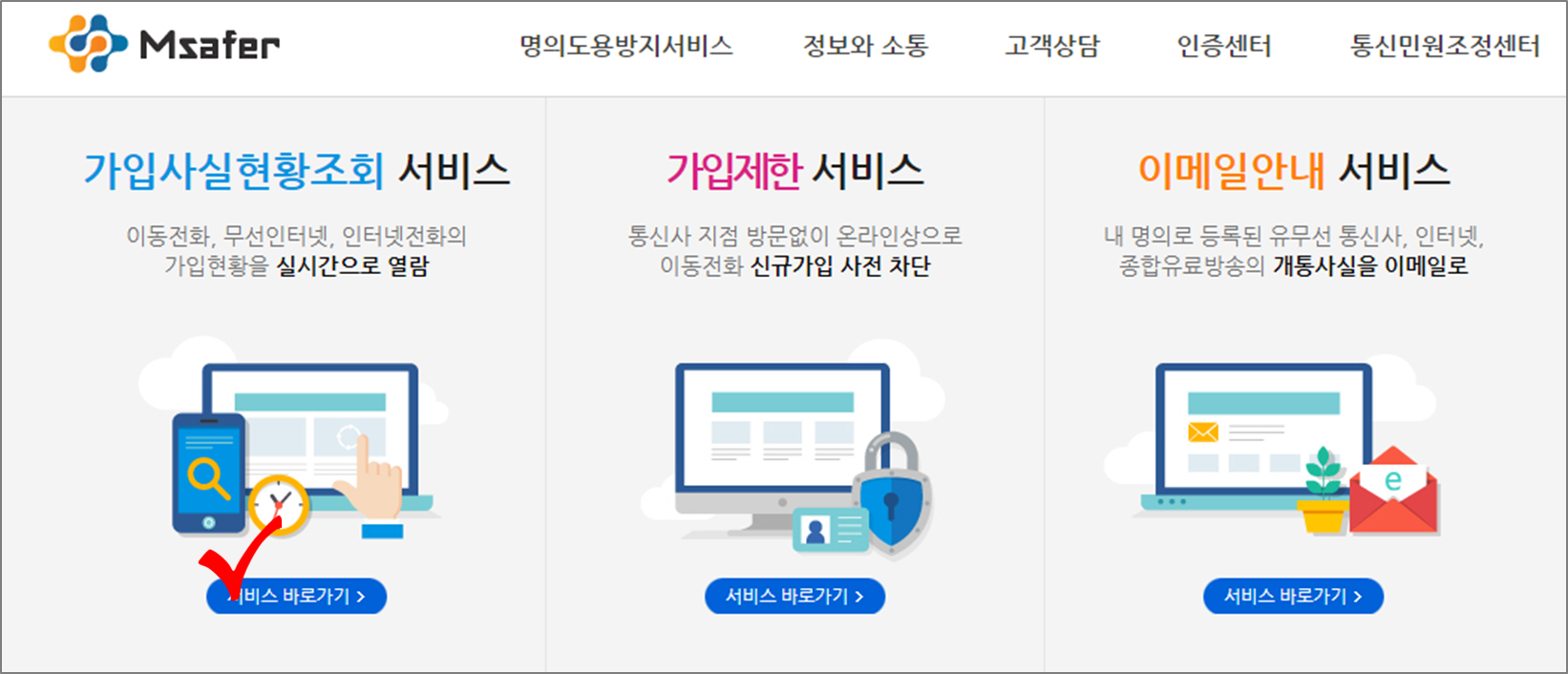통장개설 하려고 처음 새마을금고 갔는데 이미 본인의 주민등록번호로 다른 사람이 금융활동을 한 것을 알게되었다는 기사 보셨나요? 나도 모르게 개통된 핸드폰으로 신용카드를 만들어 불법 명의도용 사기를 당했다는 기사도 생각나서 미뤄왔던 명의도용 방지 서비스 무료신청을 했습니다. 아직 신청하지 않으신 분들은 엠세이퍼(Msafer) 홈페이지에서 명의도용 방지 서비스 무료 신청하시기 바랍니다. 또한 명의도용된 곳 있는지 조회하는 서비스도 무료로 이용해 보세요. 그리고 명의도용 된 사실을 발견하였을 때 신고하는 방법까지 확인하시기 바랍니다.