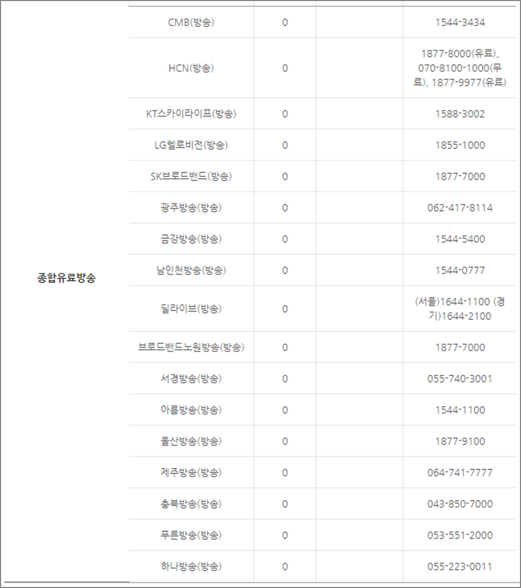 | 종합유료방송 | LG헬로비전, KT스카이라이프, 딜라이브, HCN |