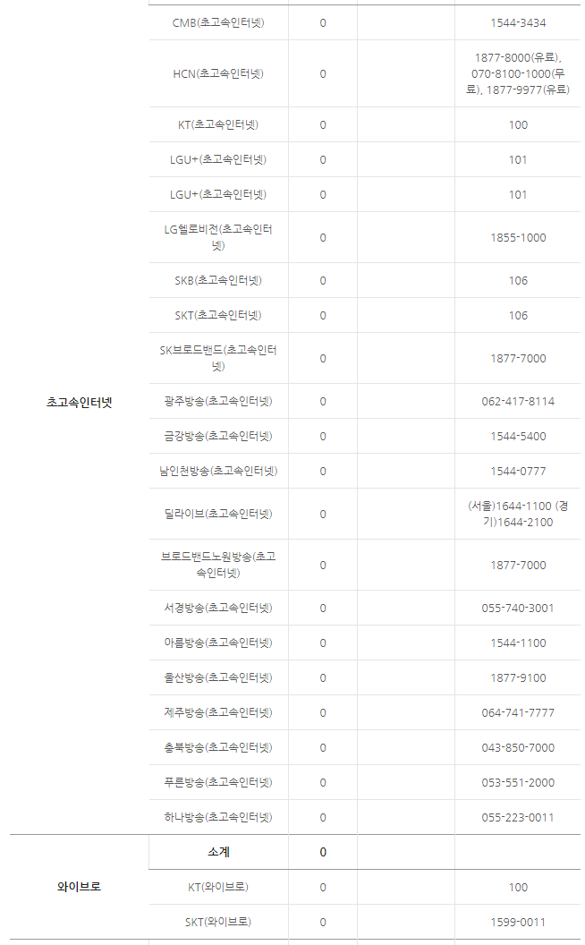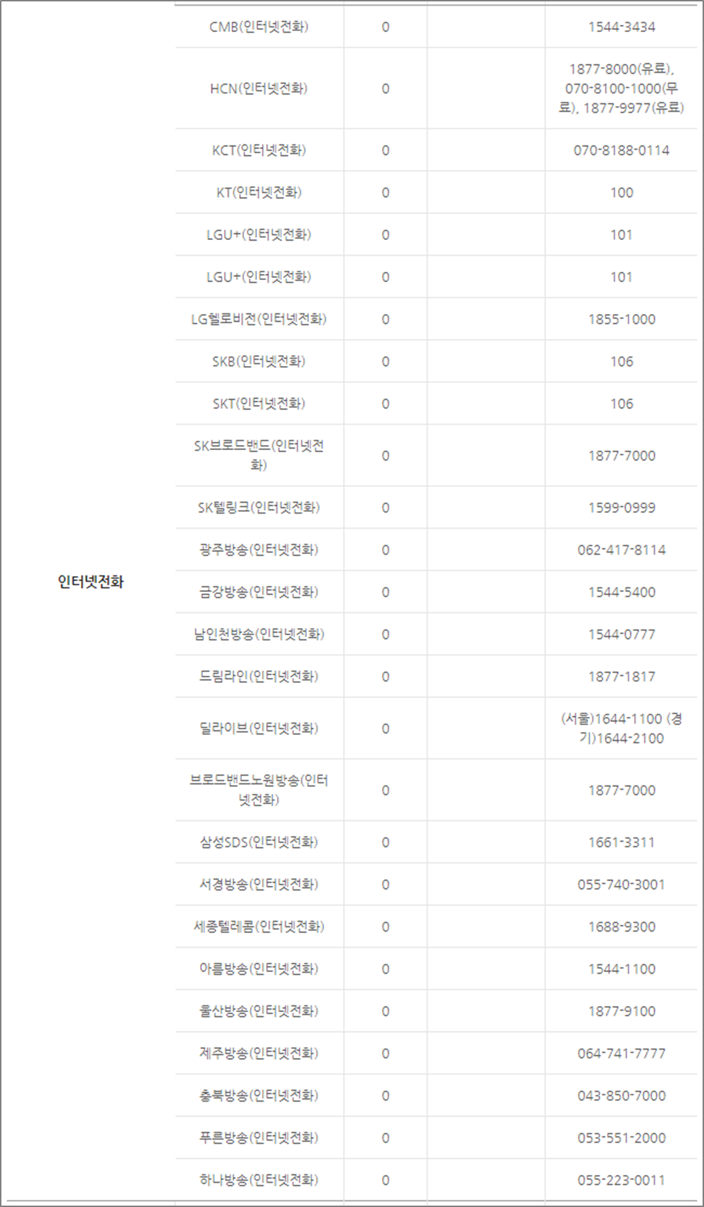 | 인터넷전화 | KT, SK브로드밴드, LGU+, SKT, LG헬로비전, 딜라이브, HCN |