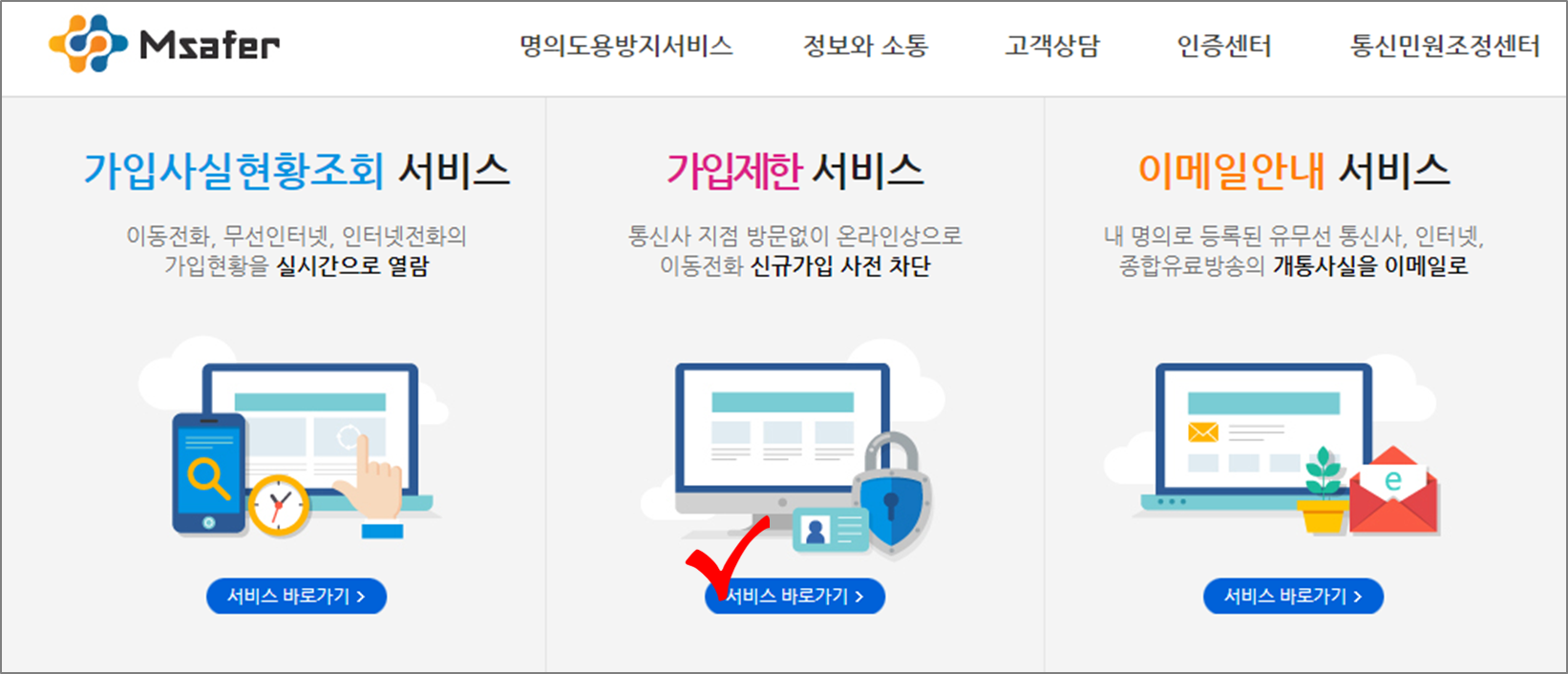 1.명의도용 방지 서비스를 신청하기 위해서는 PC를 이용해서 엠세이퍼(Msafer) 홈페이지에 접속 합니다. 회원가입은 별도로 필요없습니다. 공동인증서를 통해 로그인 → 가입제한 서비스 바로가기 클릭 → 화면 오른쪽에 "가입제한을 해제한 이동통신사"에 있는 리스트 전체 혹은 원하는 통신사를 선택 → "가입제한" 클릭하면 "가입을 제한한 이동통신사" 리스트로 넘어갑니다.