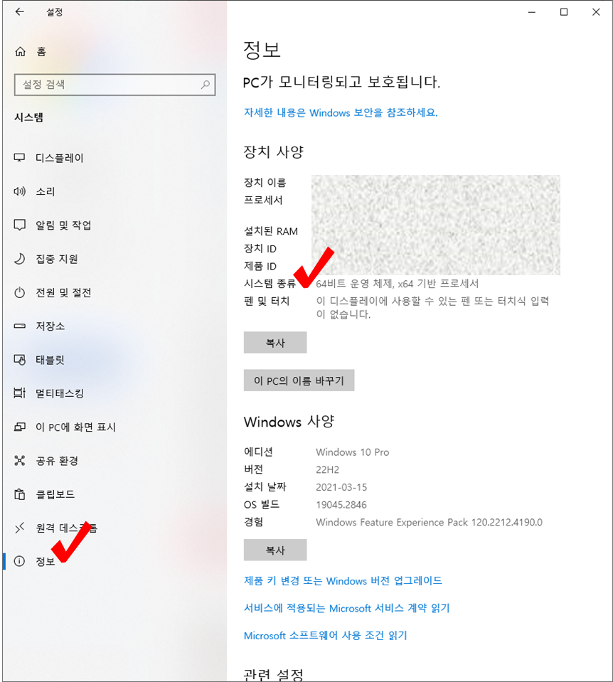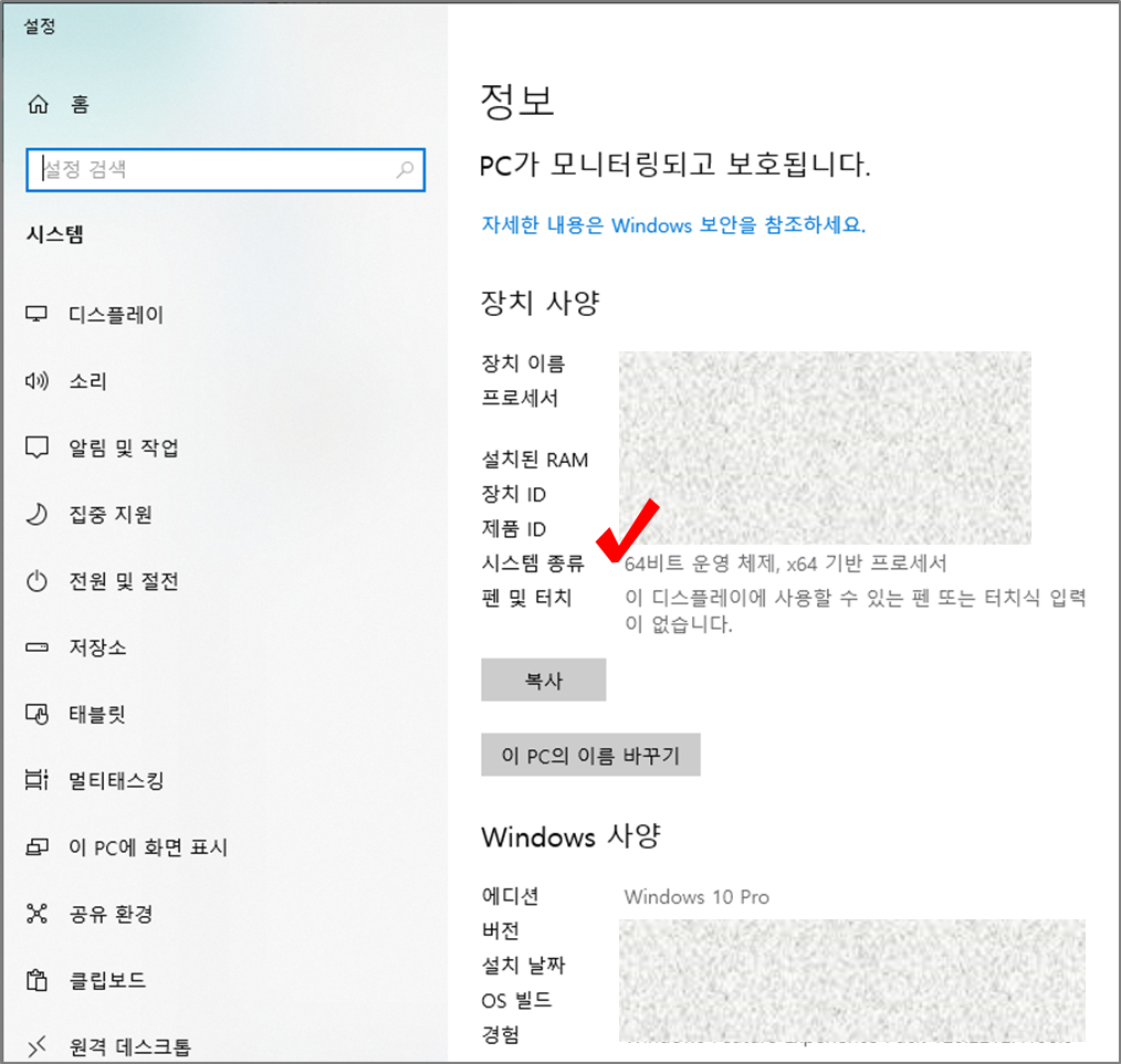 - 정보를 클릭하여 '시스템 종류'를 확인하면 됩니다.