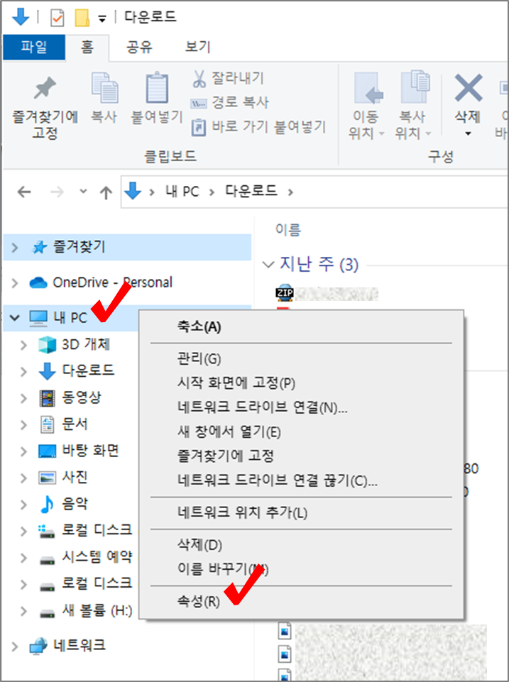 - 왼쪽 메뉴트리에서 [내pc]에 마우스 올려놓고 오른쪽 마우스 클릭한 후, 속성을 선택합니다.
