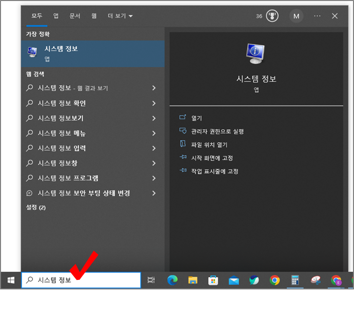 - 작업표시줄에 있는 검색칸에 "시스템 정보"라고 입력합니다.