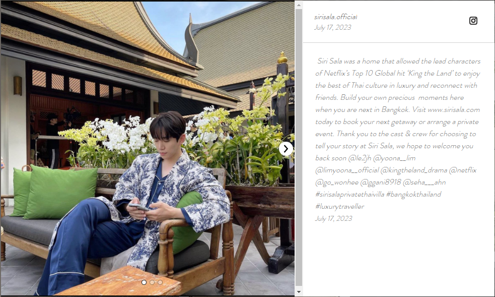 또한 킹더랜드 촬영했던 사진이 시리살라 공식 인스타그램에 올라와 있습니다. 아래 링크버튼을 통해 구경해보세요.